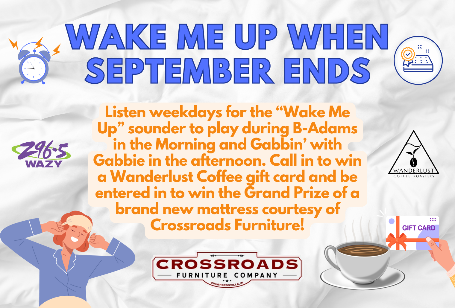 1. Listen for the "Wake Me Up When September Ends" secret sounder weekdays during B-Adams in the Morning (6-10A) and during Gabbin' with Gabbie (3-7P). The contest runs from Monday, September 16th to Friday, September 27th. There will be one sounder played per day.